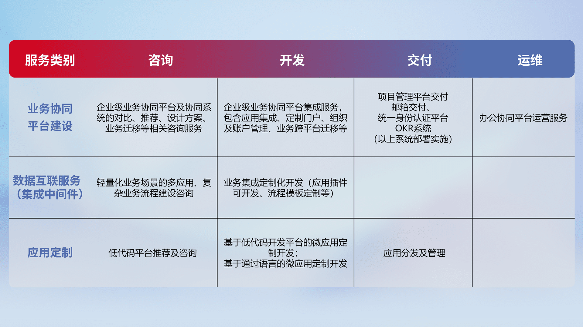 针对钉钉、、、、企微、、IDaas等平台级产品提供产品的规划、、方案、、、、交付、、定制化开发等服务,,实现如统一协同办公、、、、智能客户服务、、、混合会议管理、、智能数据查询、、、、等业务场景,,,实现数字化转型。。。。